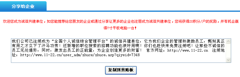 赚积分:复制框中的文字连接,推荐给您朋友的企业或通过分享让更多的企业也注册成为诚信共建单位,您将获得20积分/户的奖励,并有机会赢得7寸平板电脑一台!
