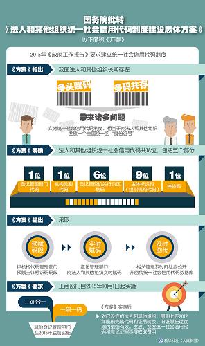 新华社北京6月17日电 经李克强总理签批,国务院日前批转发展改革委等部门制定的《法人和其他组织统一社会信用代码制度建设总体方案》(以下简称《方案》)。2015年《政府工作报告》要求建立统一社会信用代码制度,这是推动社会信用体系建设的一项重要改革措施,也是进一步深化商事制度改革,实现“三证合一”、“一照一码”的基础和前提。