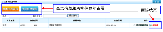 档案审核:根据姓名和身份证可以查看某个人员的档案是否已经通过上级的审核,未通过审核的用户可以查看其基本信息和考核信息,考虑是否予以审核通过。