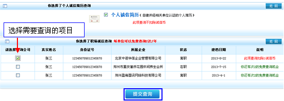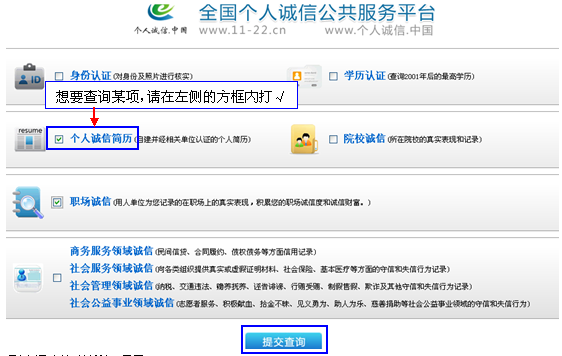 个人诚信报告查询:包括身份认证、学历认证、个人诚信简历、院校诚信、职场诚信、社会诚信。个人可以选择自己需要查询的项目。查询后生成个人诚信报告。 ①选择需要查询的项目,点击提交查询。