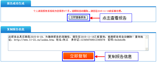 ③可以立即查看报告,或者在我的个人诚信报告里面查看;也可以点击“立即复制”报告信息发送给企业。