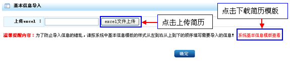 ②上传简历,点击excel文件上传按钮。浏览选择填写好的简历,点击开始上传
