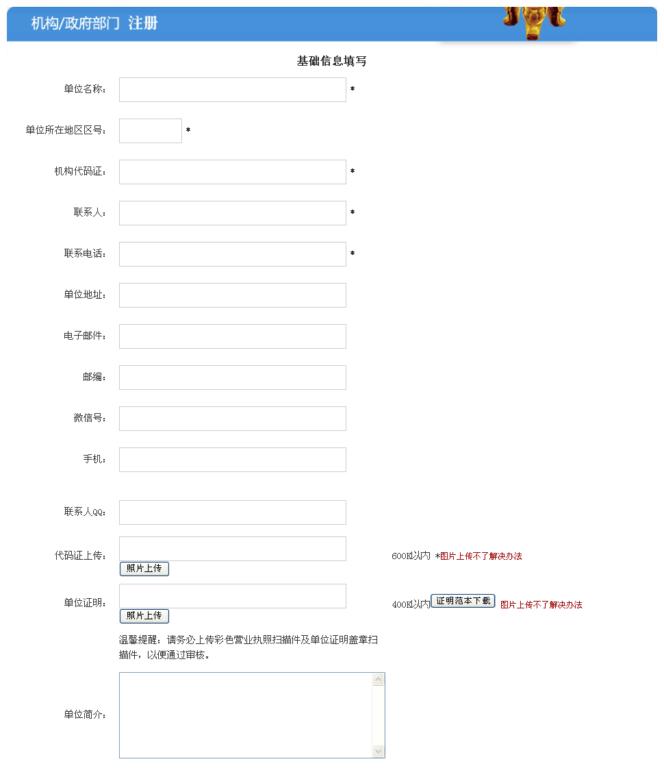 温馨提示:1.请务必上传彩色机构代码证扫描件及单位证明盖章扫描件,以便通过审核。机构代码证扫描件大小不超过600k,单位证明盖章扫描件大小不超过200k,通过电脑系统自带的图片处理软件即可实现图片压缩。